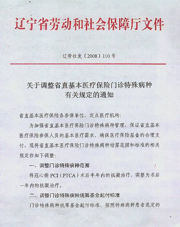 《关于调整省直基本医疗保险门诊特殊病种有关规定的通知》(辽劳社发[2008]110号)