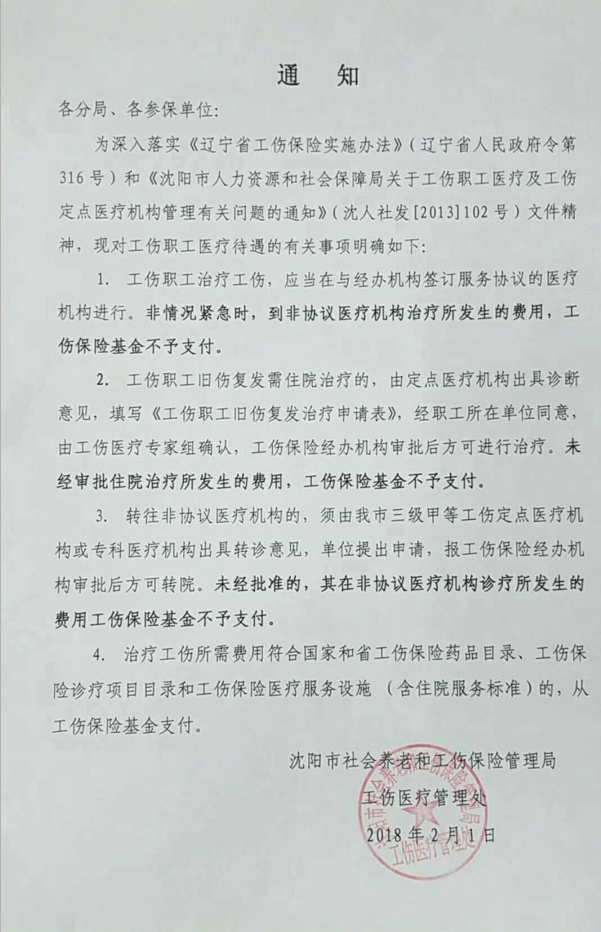 转发沈阳市社会养老和工伤保险管理局关于工伤医疗待遇注意事项的通知