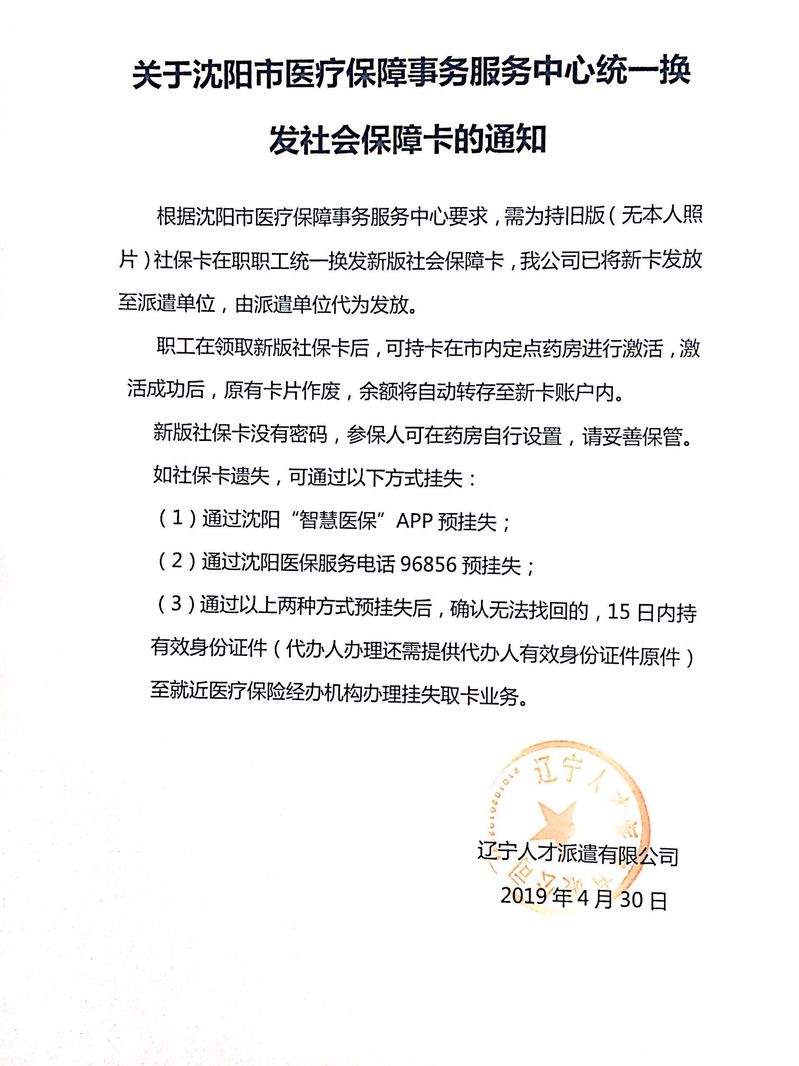 现转发辽宁人才派遣有限公司关于部分派遣人员更换社保卡的通知,请涉及部门于5月10日前来人事处领取社保卡。