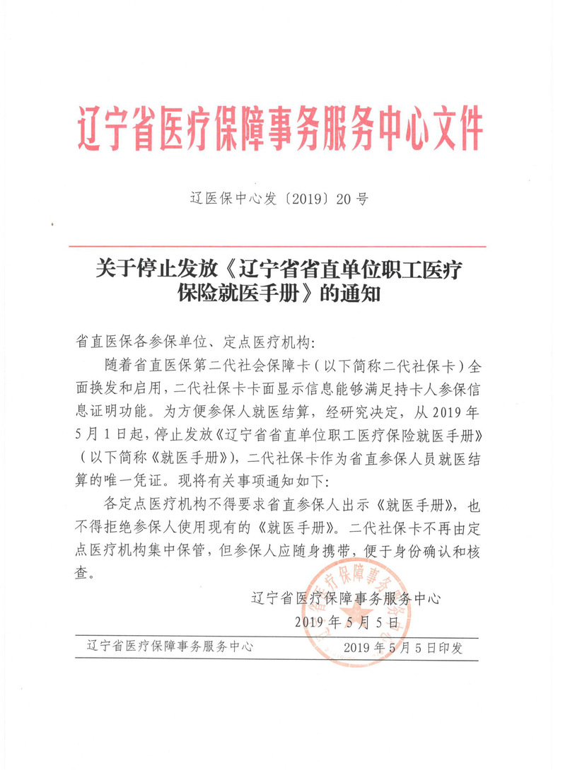 现将辽宁省医疗保障事务服务中心印发关于停止发放《辽宁省省直单位职工医疗保险就医手册》的通知(辽医保中心发〔2019〕20号)转发给你们,请将文件告知每位省医保参保人员。