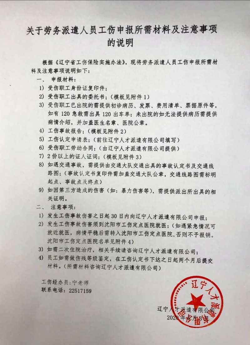 各部门: 现将辽宁人才派遣有限公司《关于劳务派遣人员工伤申报所需材料及注意事项的说明》转发给你们,请做好告知、宣传工作。附件1-委托书.docx附件2-工伤事故报告.doc附件3-证人证言.docx附件4-工伤定点医院.xls